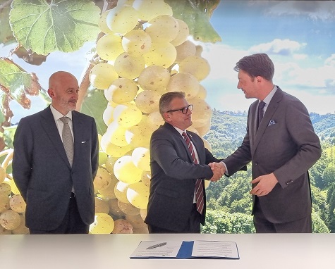 AEM senior vice president Curt Blades (center) and CEMA secretary general Jelte Wiersma (right) shake hands after the MoU signature in Bologna, in the presence of CEMA vice president Alessandro Malavolti (left)