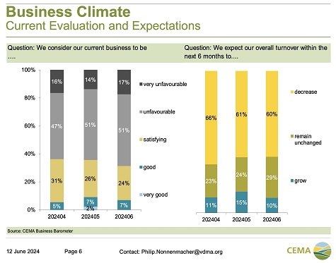 The current June business climate did not confirm the positive trend of the previous month, in which both the current business situation and the outlook for future business were rated positively for the first time in over a year. Obviously, the business situation has not yet bottomed out say CEMA. The index is currently at -56 (on a scale of -100 to +100) and has only fallen below this level in the last 10 years in 2020 during the Covid outbreak shock event.