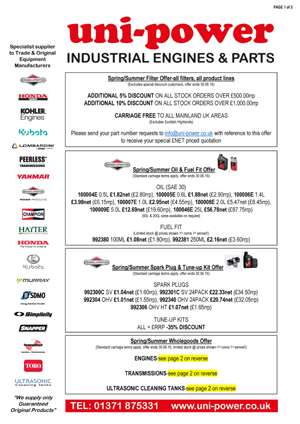 Spring/Summer parts, engine & other wholegoods offer now available from Uni-Power, with up to 10% additional discount on top of your usual trade terms & unbeatable special NET prices.