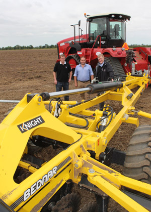Brian Knight (right) welcomes JPM Agriculture's James Hunt and Richard Carr to the Bednar distribution network