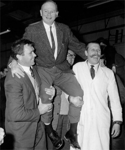 January 1964 and John Wheeldon (right) carries Mr Bamford aloft with colleague Bill Hirst after a £250,000 employee bonus is announced