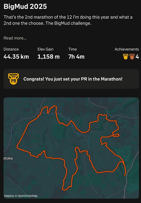 Well, I've just completed the BigMud Marathon and let me tell you, it lived up to its name! What a slog that was. I foolishly thought I might come in quicker than my first run, but I was quickly brought back down to earth. Including diversions for impassable terrain, this weekend's marathon eventually totaled a gruelling 27.5 miles and took me 7 hours and 4 minutes.