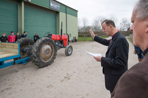 The MF 265 tractor with the students and The Right Reverend Dr John Inge, Bishop of Worcester