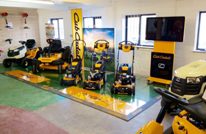 The Power-Shop system, which is currently in its pilot phase with UK Cub Cadet dealers, features a raised platform with graphics and logos to provide definition for the machines, a logo banner, a graphic backdrop and an interactive touch screen to show videos and product images.