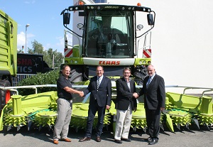 The inventors of the SHREDLAGE technology Roger Olson (left) and Ross Dale (second from right) with Hermann Lohbeck (second from left), member of the CLAAS Group Executive Board and responsible for Forage Harvesting, and Lutz Arndt (Head of Business Administration CLAAS Saulgau)