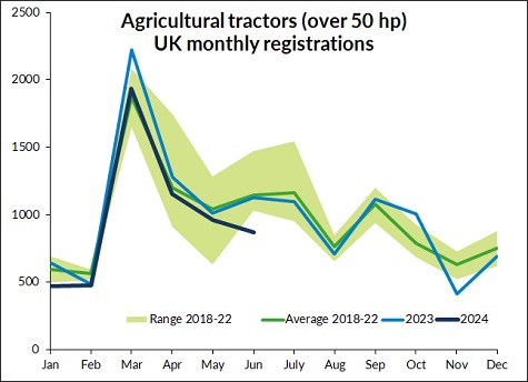 At 869 machines, the monthly total was 23% lower than in June 2023 and was down by a similar amount compared with the five-year average for the same month. That meant the total number of tractors registered during the first half of 2024 reached 5,882, 13% fewer than in the same period last year.