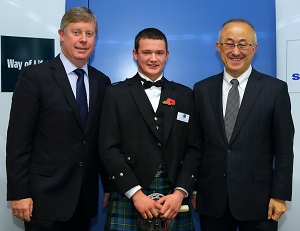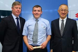 Dillan Macaskill receiving his certificate from Managing Director of Suzuki GB, Nobuo Suyama (Sam) and Director of Suzuki Aftersales (Denis Houston)