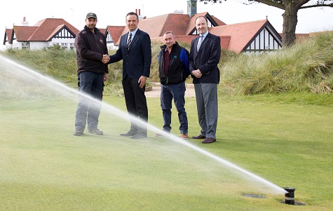 From left: links manager Gary Johnstone shakes hands with Reesink Turfcare’s irrigation manager Robert Jackson, with Aquaturf’s managing director, Stephen Daly, and Portmarnock’s golf manager, Brian Hurley