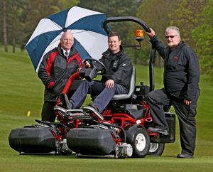 Course Manager Darren Anderson sat on the club's new Toro Greensmaster Triflex Hybrid 3420, with Nigel Lovatt, Lely UK, left and Glyn Hughes, Major Owen, right.