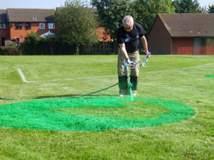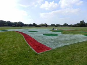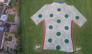 Fleet Line Markers recently painted a giant 'King of the Mountains' cycling winners jersey in Malvern where they're based to celebrate the Tour Of Britain passing through. Displayed on Lower Howsell Playing Fields the jersey was 21 metres wide at the bottom and 37 metres top to bottom and about 30 metres from sleeve to sleeve. The shape of the shirt was 'mapped' with the BeamRider (4 corners of the rectangle), using the 90 degree laser. The wavy lines were deliberate to give it a more realistic look. Green Reddispray was used for the polka dots with Q2 being used for the white and Colour XS for the red flashing. The Fleet logo was 6m x 4m and the web address under the Fleet logo was done free hand. Pictures below show progress of the painting with aerial photos courtesy of Dave and Phil from Parallel Lines.