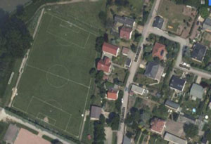 Based in the village of Grona, north of Leipzig, the pitch is so out of shape that one end of the field is 10 feet longer than the other. Also the goals don't line up and the whole thing is squished into an almost triangular shape!
