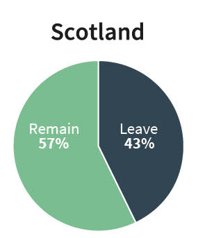 Scotland was actually the only home nation whose respondents to our survey voted in favour of remaining part of the EU, with 57% in favour compared to 43% who wished to leave.