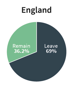 In England, 69% voted to leave with 31% choosing to remain.