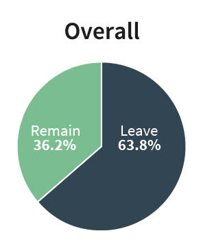 Overall the majority of respondents voted in favour of leaving the EU by a signifcant majority of 63.8% to 36.2%.