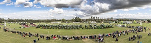A panorama showing all 50 tractors and their drivers in the ‘100 Years of John Deere Tractors’ display in the JD50 event's grand ring parade