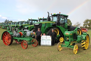 Malcolm Robinson and Harry Williams with their 1916 Overtime Model R and 1919 Waterloo Boy Model N tractors, alongside the new John Deere four-track 9620RX