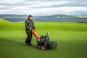 A Jacobsen Eclipse 2 mower on the 1st green, with a spectacular view across the Moray Firth