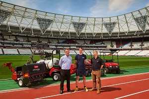 Greg Bolton, Head Groundsman at London Stadium 185, centre, with Reesink Turfcare’s Larry Pearman, left, and Danny Lake