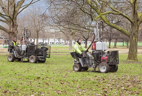 The company used its Airforce Terralift and SuperScamper machines. The latter works in conjunction with a towed compressor is therefore a lighter machine producing less weight on the turf surface. The primary areas to be treated were north of the Bandstand, an area of 10,200 m2 with sycamores and elms, and the ash tree circle north of Serpentine Road, an area of 892 m2.