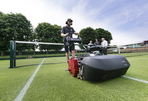 Standing from left, course and grounds manager Peter Bradburn, deputy head groundsman Ben Hunter and Reesink Turfcare’s Trevor Chard watch first assistant Simon Bailey put the Toro Greensmaster 1600 through its paces on one of the ten grass tennis courts