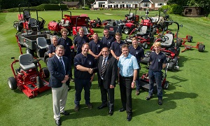 Matt Plested, Stoneham course manager (front middle left) shakes hands with Reesink’s John Pike. Richard Arnold, club manager, front left and Richard Sharpe, Kingsworthy Garden Machinery, front right.