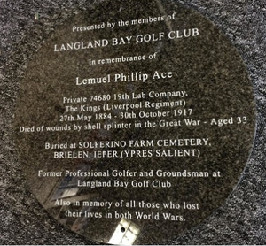 Langland Bay Golf Club in South Wales, unveiled a plaque on Friday commemorating the life of a former club greenkeeper who was killed in the First World War. The South Wales Evening Post reports that Lemuel Philip Ace was a greenkeeper and professional at the club and once officials became aware of his contribution to the war effort they were determined to mark it. The paper says Lemuel enlisted in Mumbles and served as a Private in the King's Liverpool Regiment and died of wounds from a shell splinter, aged 33, on October 30, 1917. He is buried at Brierlen, near Ypres in Belgium. A marble stone plaque has been engraved and now resides in the clubhouse following Friday's ceremony which was attended by standard bearers from King's Regiment and from Liverpool & Irish regiments.